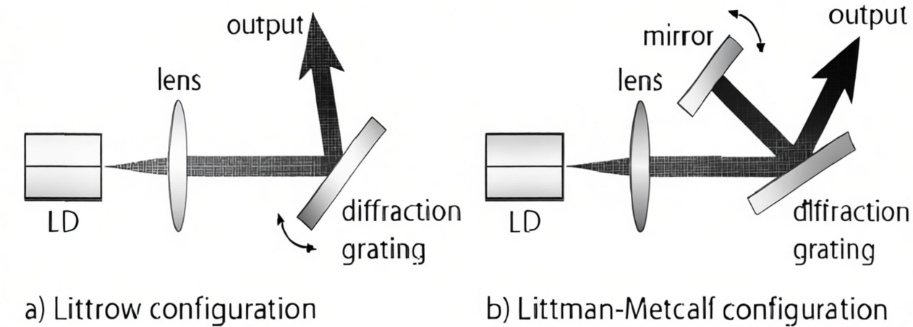 DFB နှင့် DBR ကဲ့သို့သော အတို-အခေါင်းပေါက် ပင်မလေဆာ များသည် အတွင်းပိုင်းဖိုတွန် အပြန်အလှန်တုံ့ပြန်ချိန်ကို ကန့်သတ်ထားသောကြောင့် နက်နဲသော လိုင်းဝဒ်ချုံ့ရန် ခက်ခဲစေသည်။ မျဉ်းဝဒ်ကို ပိုမိုချုံ့ပြီး ဆူညံသံများကို ဖိနှိပ်ရန်အတွက်၊ ထိုကဲ့သို့သော အပေါက်ကျဉ်းသော ပင်မ-အခေါင်းပေါက်ပုံစံများကို စွမ်းဆောင်ရည်ပိုကောင်းအောင် လုပ်ဆောင်ရန်အတွက် ပြင်ပ-ပေါက်ကြားဖွဲ့စည်းပုံများနှင့် မကြာခဏ ပေါင်းစပ်ထားသည်။ အဖြစ်များသော ပြင်ပအပေါက်အတွင်း တည်ဆောက်ပုံများသည် spatial ပြင်ပအပေါက်များ၊ ဖိုက်ဘာပြင်ပအပေါက်များနှင့် waveguide ပြင်ပအပေါက်များ ပါဝင်သည်။ ဖိုက်ဘာ-အော်ပတစ် ကိရိယာများနှင့် လှိုင်းလမ်းညွှန်ဖွဲ့စည်းပုံများ မဖြစ်ထွန်းမီတွင်၊ ပြင်ပအပေါက်များသည် အများအားဖြင့် spatial optics များဖြင့် ဖွဲ့စည်းထားသောကြောင့် သီးခြားအလင်းပြန်သည့် အစိတ်အပိုင်းများနှင့် ပေါင်းစပ်ထားသည်။ ယင်းတို့အနက်၊ grating-based spatial external-cavity feedback structures များသည် ယေဘုယျအားဖြင့် လေဆာဝင်ပေါက်၊ coupling မှန်ဘီလူးများနှင့် diffraction grating တို့ပါ၀င်သော Littrow နှင့် Littman ဒီဇိုင်းများကို အဓိကအားဖြင့် လက်ခံပါသည်။ တုံ့ပြန်ချက်ဒြပ်စင်အဖြစ် ဆန်ခါသည် လှိုင်းအလျားချိန်ညှိခြင်း၊ မုဒ်ရွေးချယ်ခြင်းနှင့် မျဉ်းအကျယ်ချုံ့ခြင်းတို့ ပြုလုပ်နိုင်သည်။