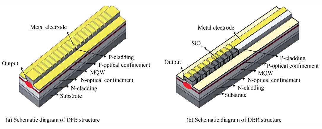 Bragg gratings များကိုအခြေခံထားသောနောက်ထပ် resonator ဖွဲ့စည်းပုံမှာ DFB configuration ဖြစ်သည်။ DFB လေဆာပင်မအပေါက်သည် Bragg ဖွဲ့စည်းပုံကို တက်ကြွသောဒေသနှင့် ပေါင်းစပ်ပြီး လှိုင်းအလျားရွေးချယ်မှုအတွက် တည်ဆောက်ပုံ၏အလယ်ဗဟိုတွင် အဆင့်ပြောင်းသည့်ဒေသကို မိတ်ဆက်ပေးသည်။ Fig. 3(b) တွင်ပြသထားသည့်အတိုင်း ဤဖွဲ့စည်းပုံသည် ပိုမိုမြင့်မားသောပေါင်းစပ်မှုနှင့် ဖွဲ့စည်းတည်ဆောက်ပုံဆိုင်ရာစည်းလုံးမှုကိုပါ၀င်ပြီး DBR တည်ဆောက်ပုံများတွင် ပြင်းထန်သောလှိုင်းအလျားပျံ့ခြင်းနှင့် မုဒ်ခုန်ခြင်းကဲ့သို့သော ပြဿနာများကို လျော့ပါးသက်သာစေပြီး ၎င်းသည် လက်ရှိအဆင့်တွင် အတည်ငြိမ်ဆုံးနှင့် လက်တွေ့ကျသောလေဆာဖွဲ့စည်းပုံဖြစ်လာစေသည်။